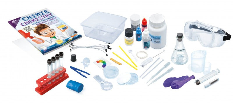 40 g de bicarbonate de soude, 20 g de solution de glycérine, 100 g de poudre de plâtre, 5 g de gélatine, 3 g de colorant rouge, 1 petite tasse, 1 grande tasse, 1 pincette, 1 cuillère à mesurer, 1 tige de mélange, 1 entonnoir, 10 fils pour bulles de savon, 1 masse à modeler, 20 bandes réactives pH, 1 échelle pH, 1 loupe et 1 pipette, 1 aimant, 1 thermomètre, 1 fil, 1 seringue, 4 tubes à essai avec bouchons, 1 porte-tube, 1 brosse pour tube à essai, 2 boîtes de Pétri, 1 récipient en plastique, 1 fiole conique, 1 bouchon avec trou, 1 bouchon pour flacon, 1 ballon de baudruche, 1 papier filtre, 2 pailles, 1 paire de lunettes de sécurité, instructions incluses avec 150 expériences (184 pages), 66 éléments