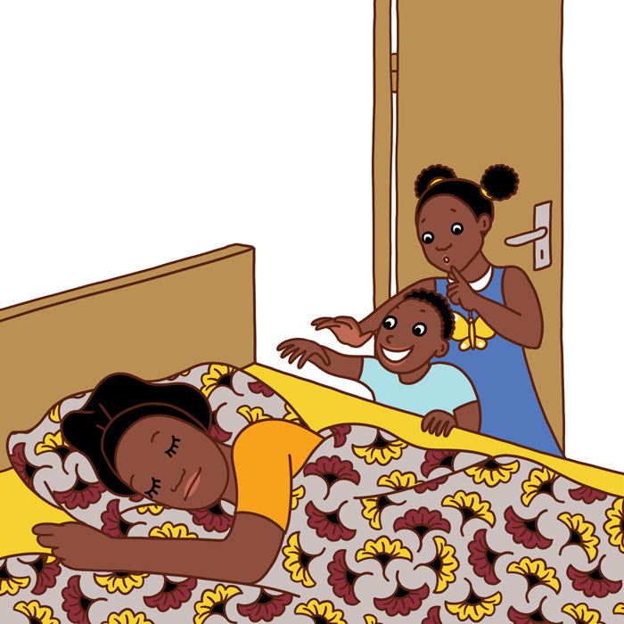 Mbiya et Kabibi, les deux sœurs, font de leur mieux pour rester silencieuses pendant que Mama profite d’un repos bien mérité.