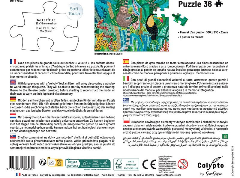 Ce puzzle de 36 pièces au toucher soft-touch invite les enfants à découvrir des animaux fascinants dans un univers coloré et apaisant. Il est accompagné d’un poster à taille réelle, idéal pour aider l’enfant à reconstituer son puzzle en toute confiance.